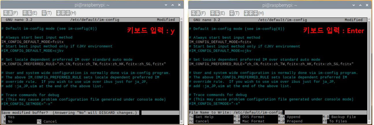 수정을 완료한 후 [Ctrl + X]를 누르면 터미널 밑에 'Save modified buffer?'라는 문구가 출력되고 [y]를 누른 후 엔터를 누르시면 됩니다.