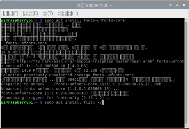 한글을 입력하기 위한 프로그램 fcitx를 설치하는 명령어를 입력합니다.