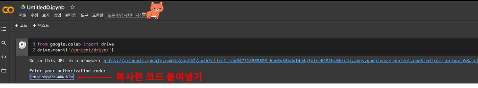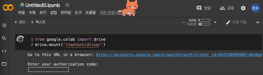 인증이 완료되면 현재 소스 코드의 디렉토리가 구글 드라이브로 변경된 것을 확인할 수 있습니다.