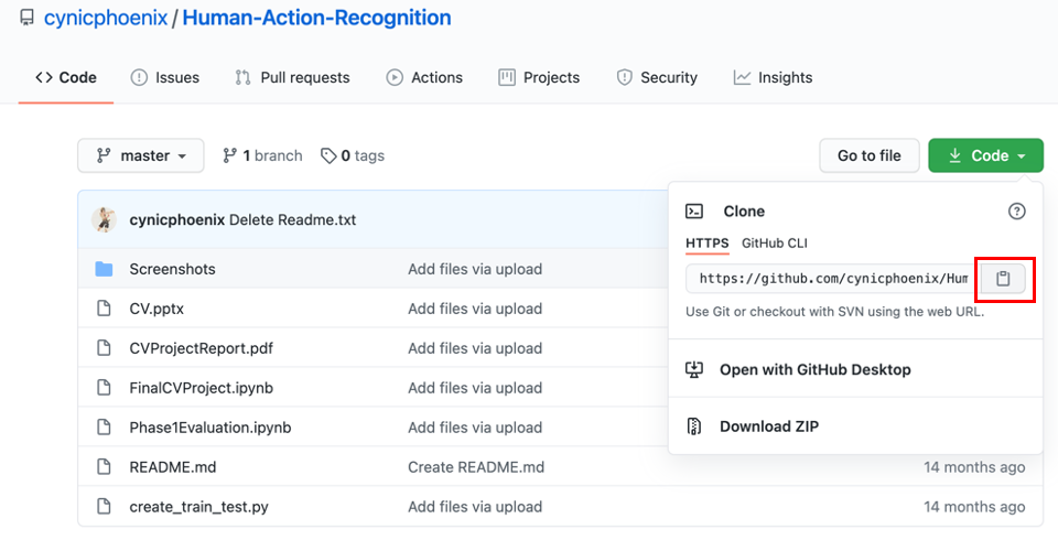 실행할 깃허브 프로젝트의 URL을 복사합니다.