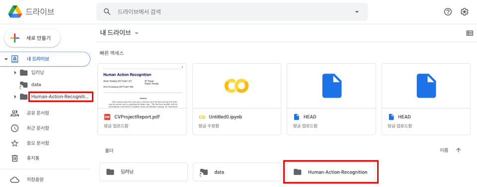 구글 드라이브에 접속해보면 해당 깃허브 프로젝트가 생성된 것을 확인할 수 있습니다.